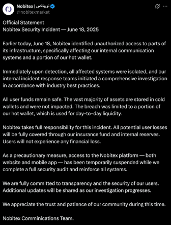 As of now, Nobitex’s website and mobile app remain offline. Iranian authorities have imposed temporary restrictions on other local crypto platforms while they investigate the incident. Users of Nobitex have reported being unable to access their funds, and peer-to-peer trading in the country has been disrupted as a result.